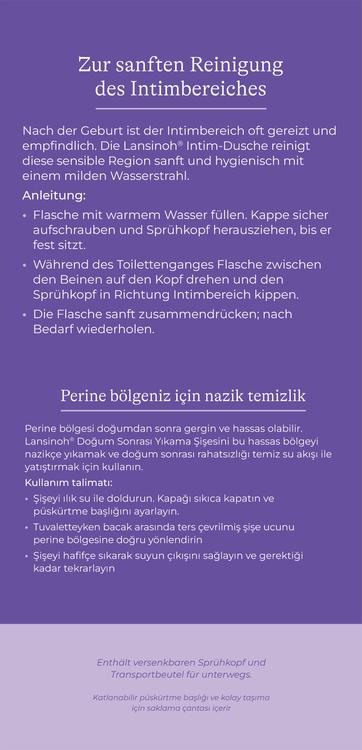 Lansinohs intimdusch erbjuder nyblivna mödrar ett skonsamt och hygieniskt sätt att rengöra intimområdet efter förlossningen. Att gå på toaletten kan vara mycket smärtsamt under den här tiden, eftersom intimområdet är irriterat och det kan svida när man kissar. Med den här praktiska intimduschen blir det en behaglig upplevelse att skölja det känsliga området med varmt vatten. Tack vare flaskans flexibla material kan den lätt klämmas ihop, vilket skapar en mild vattenstråle. Det speciella duschhuvudet kan användas upp och ner och förhindrar läckage, vilket gör det särskilt bekvämt att använda. Intimduschen är också idealisk för när du är på språng och levereras med ett praktiskt sprayhuvud och en bärväska, så att du alltid kan säkerställa en trevlig rengöringsupplevelse.