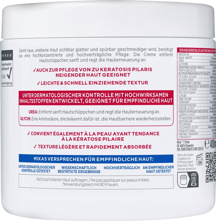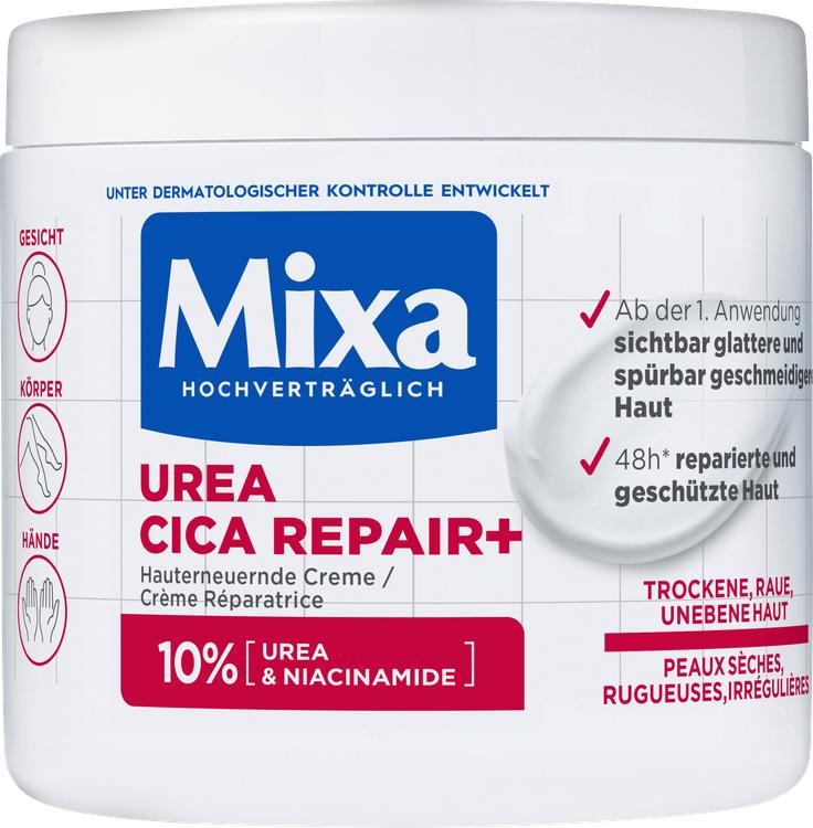 Mixa Urea Cica Repair Skin-Renewing Cream är en högeffektiv vårdformel som har utvecklats speciellt för att tillgodose behoven hos torr, grov och ojämn hud. Med ett högt innehåll av 10 % urea och niacinamider ger denna kräm intensiv återfuktning och reparerar huden på djupet. En synlig förbättring av hudens struktur kan ses redan efter första appliceringen: Huden blir slätare och smidigare. Krämen stimulerar också hudförnyelsen och avlägsnar försiktigt döda hudceller, så att huden återfår sin lyster. Tack vare sin snabbabsorberande och icke-feta konsistens lämnar Mixa Urea Cica Repair Cream en behaglig känsla i huden och minskar känslan av stramhet under lång tid. Den är lämplig för ansikte, kropp och händer och skyddar effektivt huden mot yttre påverkan.
