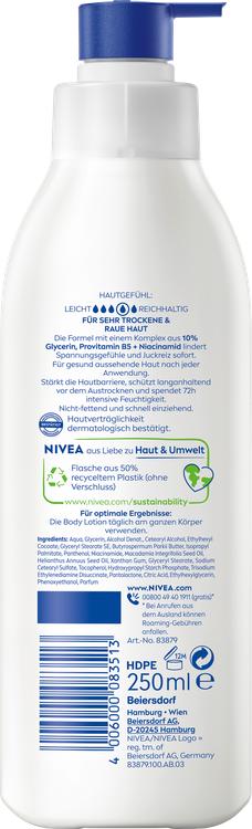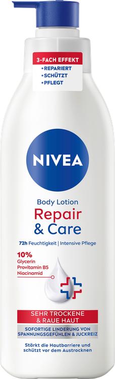 Nivea Repair & Care Body Lotion är den perfekta lösningen för alla som vill ha mer än bara fukt för sin hud. Med en unik trippeleffekt reparerar, skyddar och vårdar den mycket torr och grov hud. Den förbättrade formulan innehåller ett högeffektivt komplex av 10% glycerin, provitamin B5 och niacinamid, som omedelbart lindrar känslan av stramhet och klåda. Lotionen stärker hudens barriär och ger ett långvarigt skydd mot torrhet. Njut av upp till 72 timmar av intensiv fukt och en hälsosam hudkänsla efter varje applicering. Nivea Repair & Care Body Lotion absorberas snabbt och lämnar ingen fet hinna. Den är dermatologiskt testad och hudvänlig och ger dig inte bara en märkbar utan också en synlig vårdeffekt. Dessutom är flaskan tillverkad av 50% återvunnen plast, vilket understryker vårt engagemang för miljövänlighet.
