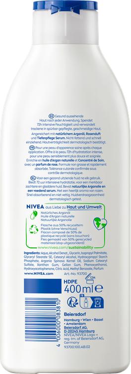 Upptäck Nivea Body Lotion Rose Blossom & Care, som skämmer bort din hud med 72 timmars intensiv fukt. Denna lyxiga lotion kombinerar de återfuktande egenskaperna hos Nivea Deep Care Serum med naturlig arganolja och en förförisk rosendoft som skämmer bort både hud och sinnen. Den icke-feta formulan absorberas snabbt och lämnar huden sammetslen och mjuk, vilket du inte bara kan känna utan också se. Denna dermatologiskt testade body lotion är perfekt för dig som förväntar dig mer av din hudvård. I över 100 år har Nivea stått för kvalitet och ett noggrant urval av ingredienser för att erbjuda dig en produkt som inte bara gynnar din hud utan också miljön. Flaskan är tillverkad av 50% återvunnen plast, vilket understryker vårt engagemang för hållbarhet.