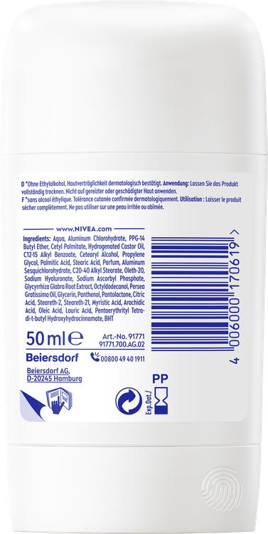 Upptäck Nivea Derma Control deodorant stick, som ger upp till 72 timmars aktivt skydd för en mjuk och välvårdad hudkänsla. Den innovativa formulan kombinerar ren hyaluronsyra med en mild formula för att lugna huden under armarna och skydda den mot irritation efter rakning. Njut av en långvarig känsla av fräschör hela dagen, medan deodorantstiftet samtidigt vårdar huden och minskar friktionen som orsakas av kläder. Fri från etylalkohol och dermatologiskt testad är detta deostick det perfekta valet för känslig hud och hjälper dig att känna dig helt bekväm.