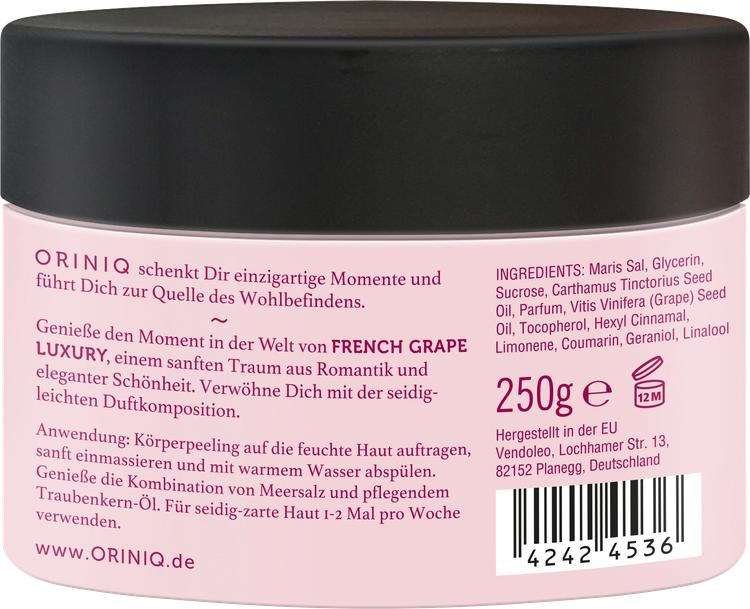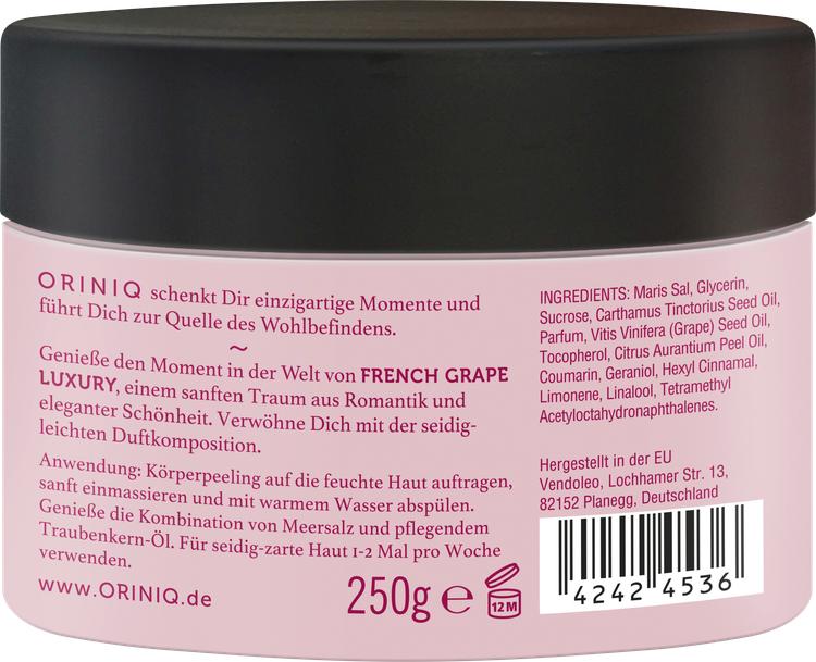 Upptäck den lyxiga Oriniq French Grape Luxury cream-oil scrub, en unik hudvårdsprodukt som skämmer bort din hud med en kombination av högkvalitativ druvkärnolja och vitaliserande havssalt. Den här veganska skrubben är tillverkad utan mikroplaster och vattenlösliga, rent syntetiska polymerer, så du behöver inte oroa dig för skadliga ingredienser när du exfolierar huden. Cream-oil scrubben garanterar inte bara en grundlig rengöring, utan ger också en oemotståndlig doftupplevelse som påminner om romantiska franska stunder. Skäm bort dig själv och din hud med denna exklusiva vård som gör den mjuk, smidig och vitaliserad.