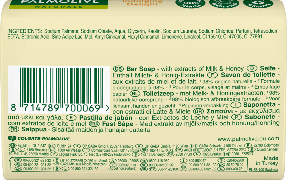 SODIUM PALMATE, SODIUM OLEATE, AQUA, GLYCERIN, SODIUM LAURATE, PARFUM, SODIUM CHLORIDE, TETRASODIUM EDTA, ETIDRONIC ACID, SINE ADIPE LAC, MEL, AMYL CINNAMAL, HEXYL CINNAMAL, LIMONENE, CI 15510, CI 47005, CI 77891.