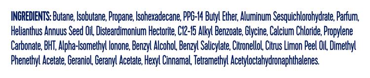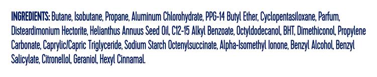 BUTANE, ISOBUTANE, PROPANE, ALUMINUM CHLOROHYDRATE, PPG-14 BUTYL ETHER, CYCLOPENTASILOXANE, PARFUM, DISTEARDIMONIUM HECTORITE, HELIANTHUS ANNUUS SEED OIL, C12-15 ALKYL BENZOATE, OCTYLDODECANOL, BHT, DIMETHICONOL, PROPYLENE CARBONATE, CAPRYLIC/CAPRIC TRIGLYCERIDE, SODIUM STARCH OCTENYLSUCCINATE, ALPHA-ISOMETHYL IONONE, BENZYL ALCOHOL, BENZYL SALICYLATE, CITRONELLOL, GERANIOL, HEXYL CINNAMAL.