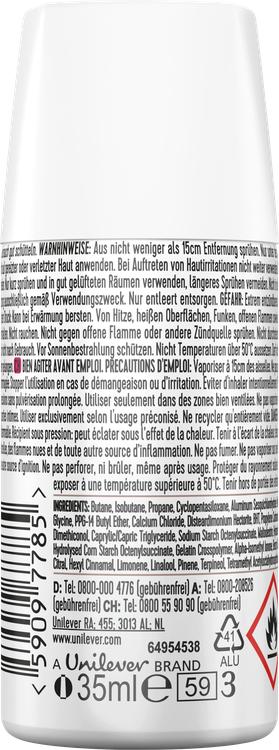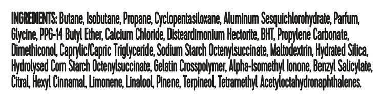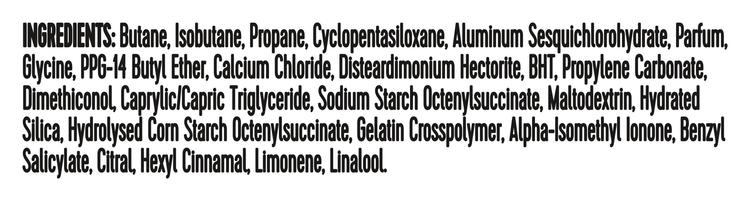 BUTANE, ISOBUTANE, PROPANE, CYCLOPENTASILOXANE, ALUMINUM SESQUICHLOROHYDRATE, PARFUM, GLYCINE, PPG-14 BUTYL ETHER, CALCIUM CHLORIDE, DISTEARDIMONIUM HECTORITE, BHT, PROPYLENE CARBONATE, DIMETHICONOL, CAPRYLIC/CAPRIC TRIGLYCERIDE, SODIUM STARCH OCTENYLSUCCINATE, MALTODEXTRIN, HYDRATED SILICA, HYDROLYSED CORN STARCH OCTENYLSUCCINATE, GELATIN CROSPOLYMER, ALPHA-ISOMETHYL IONONE, BENZYL SALICYLATE, CITRAL, HEXYL CINNAMAL, LIMONENE, LINLOOL.