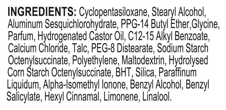 CYCLOPENTASILOXANE, STEARYL ALCOHOL, ALUMINUM SESQUICHLOROHYDRATE, PPG-14 BUTYL ETHER, GLYCINE, PARFUM, HYDROGENATED CASTOR OIL, C12-15 ALKYL BENZOATE, CALCIUM CHLORIDE, TALC, PEG-8 DISTEARATE, SODIUM STARCH OCTENYLSUCCINATE, POLYETHYLENE, MALTODEXTRIN, HYDROLYSED CORN STARCH OCTENYLSUCCINATE, BHT, SILICA, PARAFFINUM LIQUIDUM, ALPHA-ISOMETHYL IONONE, BENZYL ALCOHOL, BENZYL SALICYLATE, HEXYL CINNAMAL, LIMONENE, LINALOOL.