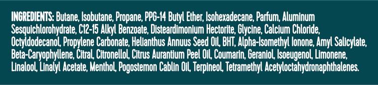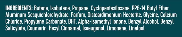 BUTANE, ISOBUTANE, PROPANE, CYCLOPENTASILOXANE, PPG-14 BUTYL ETHER, ALUMINUM SESQUICHLOROHYDRATE, PARFUM, DISTEARDIMONIUM HECTORITE, GLYCINE, CALCIUM CHLORIDE, PROPYLENE CARBONATE, BHT, ALPHA-ISOMETHYL IONONE, BENZYL ALCOHOL, BENZYL SALICYLATE, COUMARIN, HEXYL CINNAMAL, ISOEUGENOL, LIMONENE, LINALOOL.
