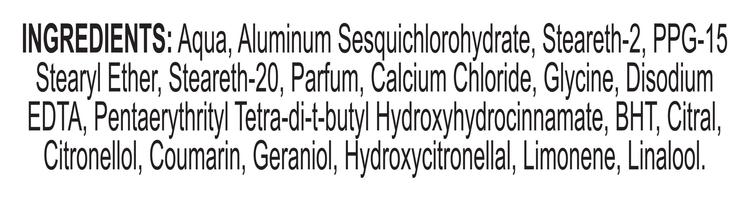 AQUA, ALUMINUM SESQUICHLOROHYDRATE, STEARETH-2, PPG-15 STEARYL ETHER, STEARETH-20, PARFUM, CALCIUM CHLORIDE, GLYCINE, DISODIUM EDTA, PENTAERYTHRITYL TETRA-DI-T-BUTYL HYDROXYHYDROCINNAMATE, BHT, CITRAL, CITRONELLOL, COUMARIN, GERANIOL, HYDROXYCITRONELLAL, LIMONENE, LINALOOL.