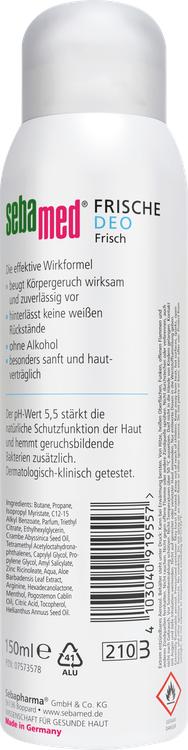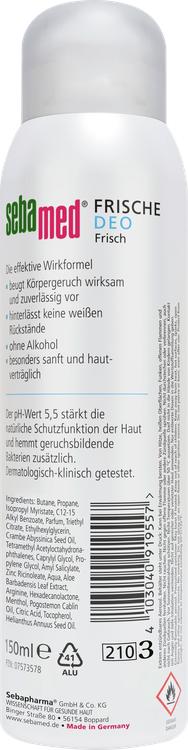 Sebamed Deodorant Spray Fresh erbjuder en skonsam och effektiv lösning för känslig hud. Den skyddar på ett tillförlitligt sätt mot kroppslukt utan att undertrycka den naturliga svettningen. Tack vare det biologiska verkningssystemet binder sprayen luktämnen och hämmar spridningen av luktframkallande bakterier. Berikad med aloe vera återfuktar och lugnar den huden. pH-värdet på 5,5 stärker hudens egen skyddsfunktion mot yttre påverkan och säkerställer en hudvänlig applicering. Deodorantsprayen är fri från aluminiumsalter, alkohol, färgämnen och konserveringsmedel och lämnar inga vita rester på kläderna.