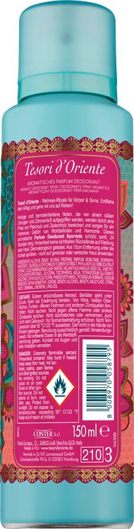 Upplev en harmonisk kombination av doft och skydd med Tesori d'Oriente Ayurveda deodorant spray. Denna deodorant kombinerar de välgörande egenskaperna hos amla-frukten och den jordnära aromen av patchouli i en unik parfymdeodorant. De träiga och bärnstensfärgade noterna kompletteras med söta accenter av apelsin och citron, vilket skapar en avkopplande atmosfär som säkerställer ditt välbefinnande. Det 24-timmars deodorantskyddet är skonsamt mot huden och lämnar inga rester på dina kläder eller hud, så att du kan hålla dig fräsch och självsäker hela dagen. Denna deodorantspray är dermatologiskt testad och erbjuder en unik kombination av deodorant och parfym som kommer att glädja dig.