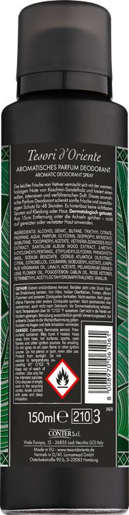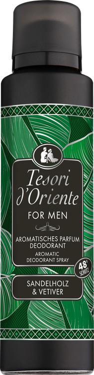 Upplev Orientens fascinerande elegans med Tesori d'Oriente deodorant för män i doftkombinationen sandelträ & vetiver. Denna aromatiska deodorantspray ger ett tillförlitligt skydd i upp till 48 timmar och omsluter dig med en varm, träig doft som fulländas av vetiverns fräscha elegans. Den harmoniska kombinationen av sandelträ med syrliga accenter av ingefära och bergamott skapar en intensiv doftupplevelse som är både lugnande och förförisk. Den praktiska aluminiumflaskan är inte bara en snygg accessoar, utan också perfekt att ha med sig på resan och en utmärkt presentidé för speciella tillfällen.