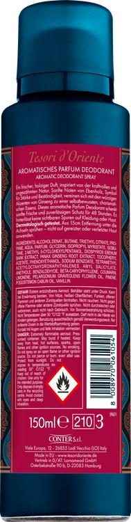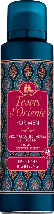 Fördjupa dig i Orientens fascinerande värld med Tesori d'Oriente deodorant för män, som kombinerar de kraftfulla aromerna av ebenholts och ginseng. Denna aromatiska deodorantspray ger inte bara ett tillförlitligt skydd i upp till 48 timmar, utan skämmer också bort dina sinnen med en varm, träig fougère-essens som förstärks av fräscha och blommiga noter. Den uppfriskande doften av ebenholts möter de vitaliserande egenskaperna hos ginseng för att skapa en unik wellnessupplevelse för kropp och själ. Den eleganta aluminiumflaskan är inte bara behändig och praktisk när du är på språng, utan också en snygg accessoar som är en utmärkt present till dina nära och kära. Upplev långvarig fräschör och en omisskännlig doftupplevelse, oavsett om det gäller daglig användning eller speciella tillfällen.