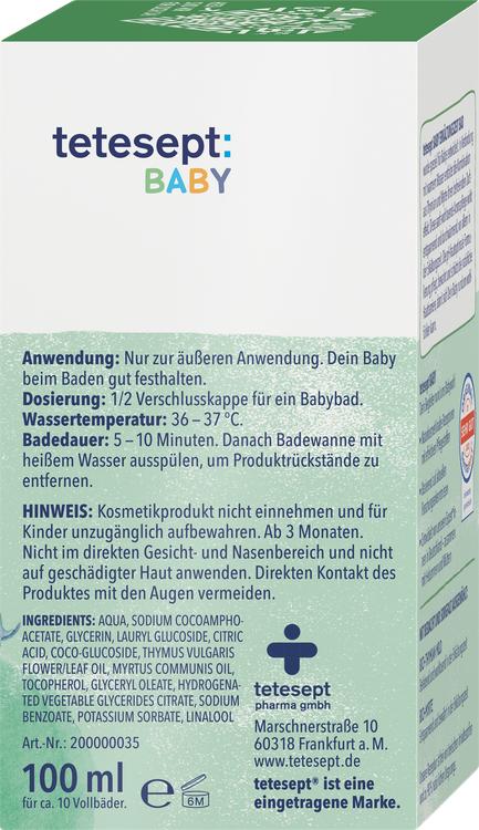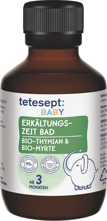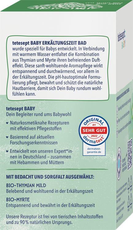 Tetesept Baby Cold Time Bath har utvecklats speciellt för känslig hud hos spädbarn från 3 månader och uppåt. Den kombinerar de lugnande egenskaperna hos ekologisk timjan och ekologisk myrten, som har en befriande dofteffekt när de kombineras med varmt vatten. Denna milda doftvård har en avslappnande och värmande effekt, särskilt under den kalla årstiden, och säkerställer att ditt barn känner sig helt bekvämt. Den pH-hudoptimerade formulan skyddar och bevarar den naturliga hudbarriären samtidigt som den förser huden med värdefulla vårdande ingredienser. Med en hög andel av 90% naturliga ingredienser är badet särskilt snällt mot huden och fritt från mikroplaster och vattenlösliga, rent syntetiska polymerer. Tetesept Baby Cold Time Bath är utvecklat av experter i Tyskland i samarbete med barnmorskor och mödrar och erbjuder kärleksfullt stöd för ditt barn under den kalla årstiden.