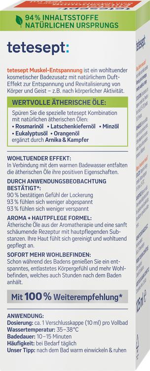 Tetesept Health Bath Muscle Relaxation är den perfekta badtillsatsen för alla som vill koppla av och återuppliva efter fysisk aktivitet. Med en noggrant balanserad blandning av naturliga eteriska oljor, inklusive rosmarin-, citron-, mynta-, kryddnejlika-, eukalyptus- och apelsinoljor, erbjuder detta bad en lugnande upplevelse. Förstärkt med kamfer och salicylat förvandlas ditt bad till en oas av avkoppling. Den dermatologiskt bekräftade hudkompatibiliteten och den veganska formulan, som är fri från mikroplaster, fotogener, silikoner och mineraloljor, säkerställer att du kan känna dig helt lugn. Unna dig en välförtjänt paus efter ett ansträngande träningspass och njut av den vitaliserande effekten av denna speciella badtillsats.