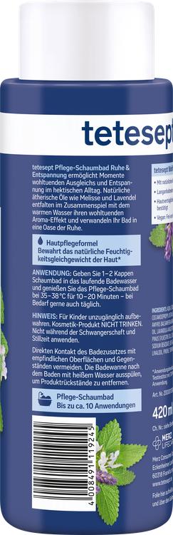 Upplev en paus från den hektiska vardagen med Tetesept Calm & Relaxation bubbelbad. Detta närande bubbelbad förvandlar ditt badrum till en avkopplande oas av lugn. De naturliga eteriska oljorna från citronmeliss och lavendel utvecklar sin lugnande arom vid kontakt med varmt vatten och ger en känsla av djup avslappning. Det långvariga, mjuka skummet omsluter din hud och ger dig en lugnande känsla av omsorg. Den veganska konsistensen garanterar att produkten är fri från animaliska ingredienser och är därför också lämplig för medvetna användare. Unna dig en stund av balans och avslappning med detta unika bubbelbad.