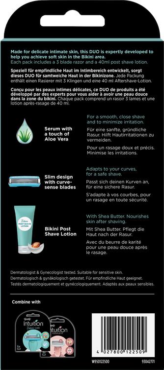 Intuition Bikini Care Duo från Wilkinson Sword är utvecklad för de speciella behoven hos känslig hud i intimområdet och ger en skonsam och nära rakning. Setet innehåller en högkvalitativ rakhyvel med tre blad, som anpassar sig perfekt till bikinilinjens kurvor, och en 40 ml aftershave-lotion. Denna lotion innehåller vårdande sheasmör och hjälper till att lugna och vårda huden efter rakning. Med ett högt återvunnet innehåll på minst 70% är produkten också miljövänlig. Njut av sammetsmjuk hud i bikiniområdet med denna specialutvecklade vårdduo.