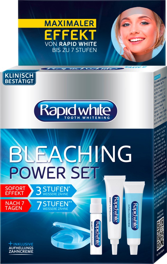 Tjänar till tandblekning: Omedelbar effekt: Upp till 3 steg* vitare tänder och efter 7 dagar upp till 7 steg** vitare tänder – helt utan vätgaskoncentration. Det kraftfulla Rapid White Bleaching Power Set ger ett strålande leende på bara en vecka.